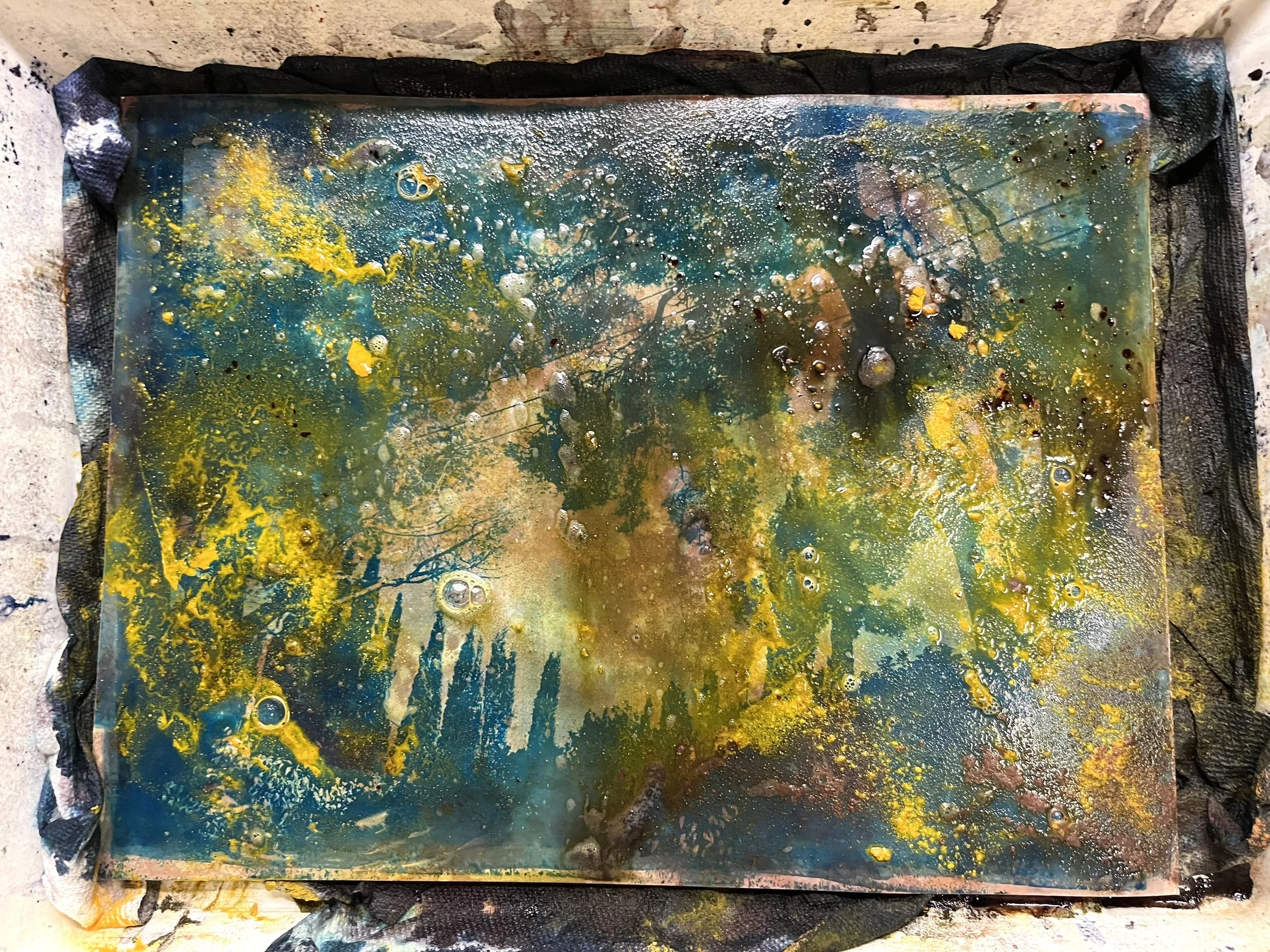 6 - Add toning elements (turmeric, teas, soap, wine tannin, pomegranate powder, etc) to create abstract effects.