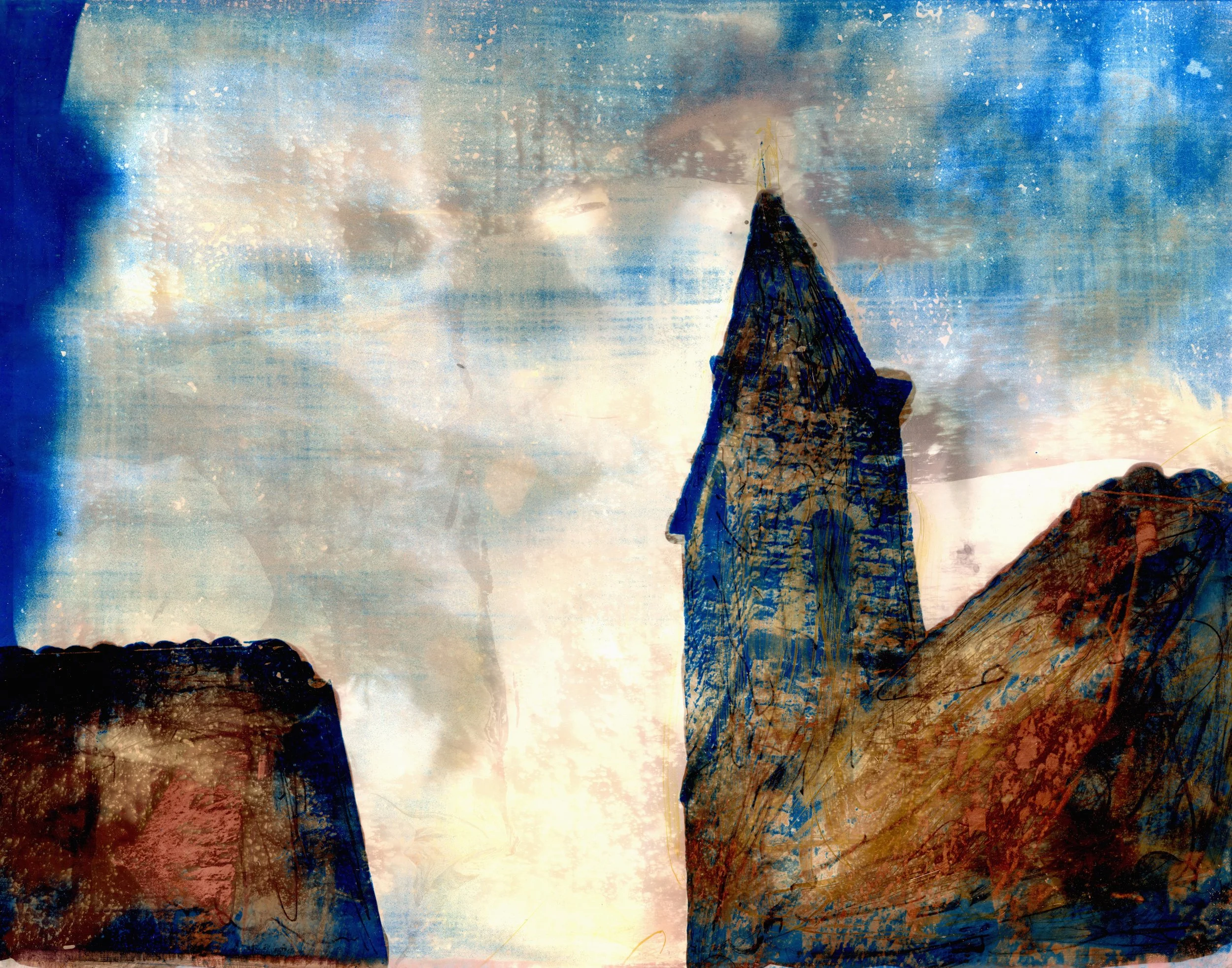 Using an experimental cyano-lumen process, these prints combine multiple exposures of cyanotype chemistry on photographic paper with materials such as tannin powder, turmeric and bleach. Subject to chance and chemistry, this method embodies the unpredictability of transformation.